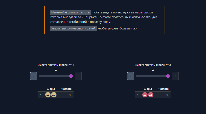 Игрок может добавлять популярные пары в свои билеты, балансировать между часто и реже выпадающими двойками и выделять интересующие числа для дальнейшего использования в генераторах комбинаций на сайте.