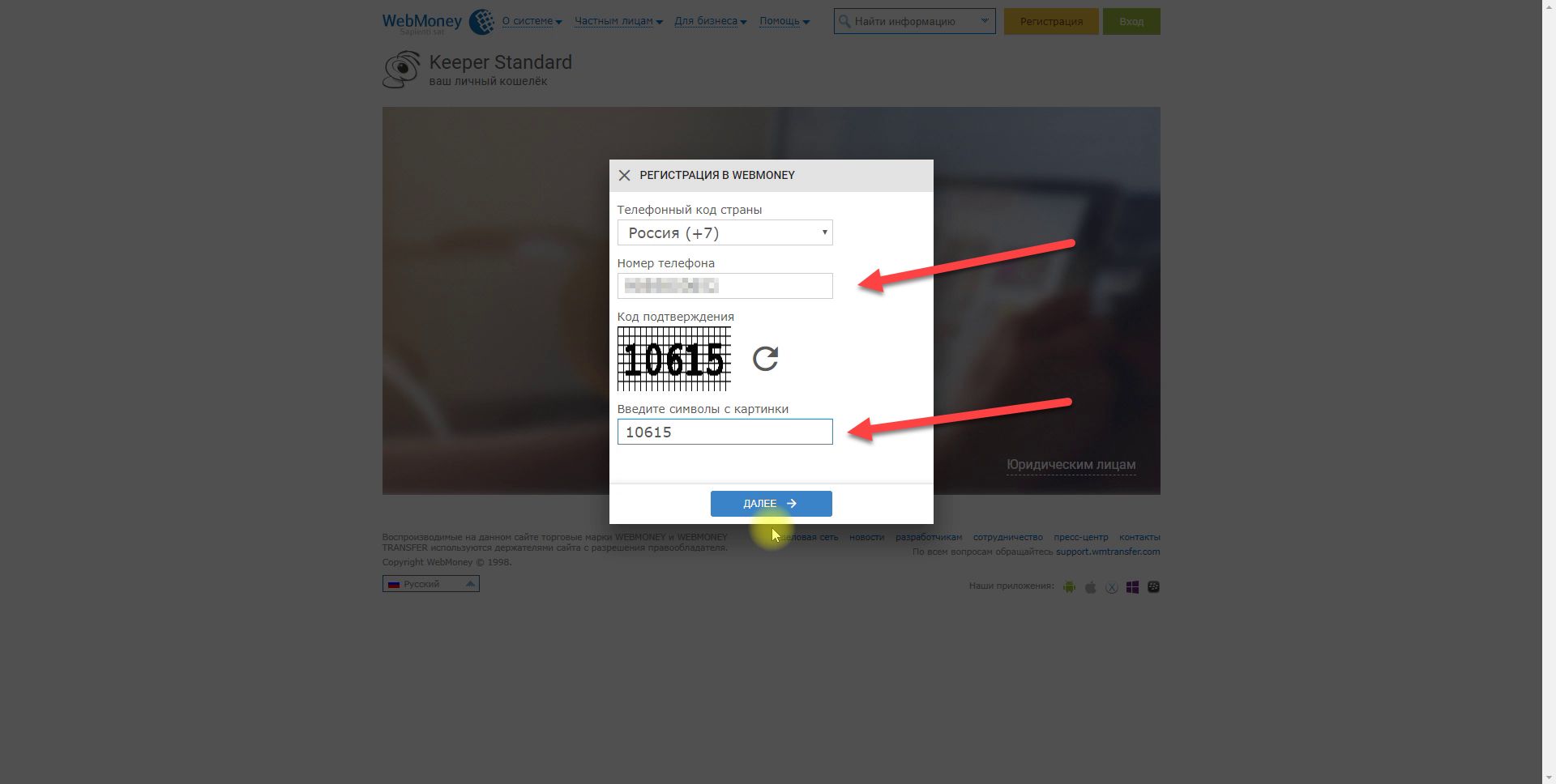 2. Указываем номер мобильного телефона и цифры с картинки, нажимаем кнопку "Далее".