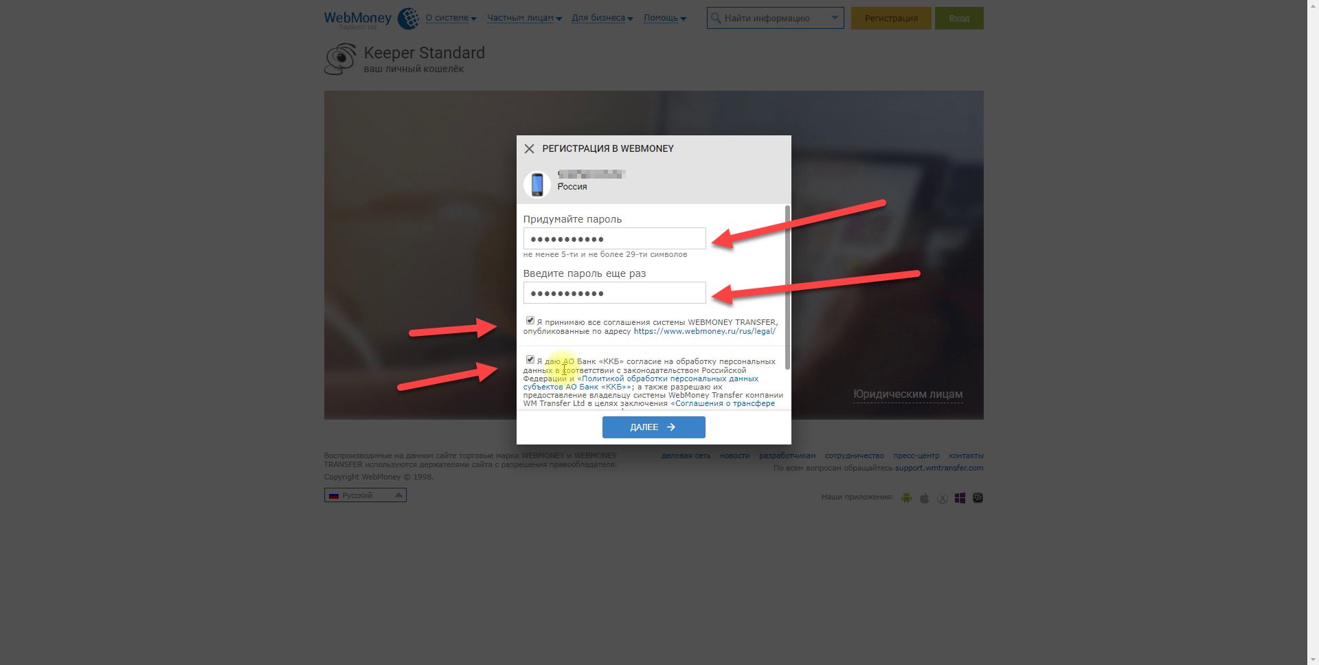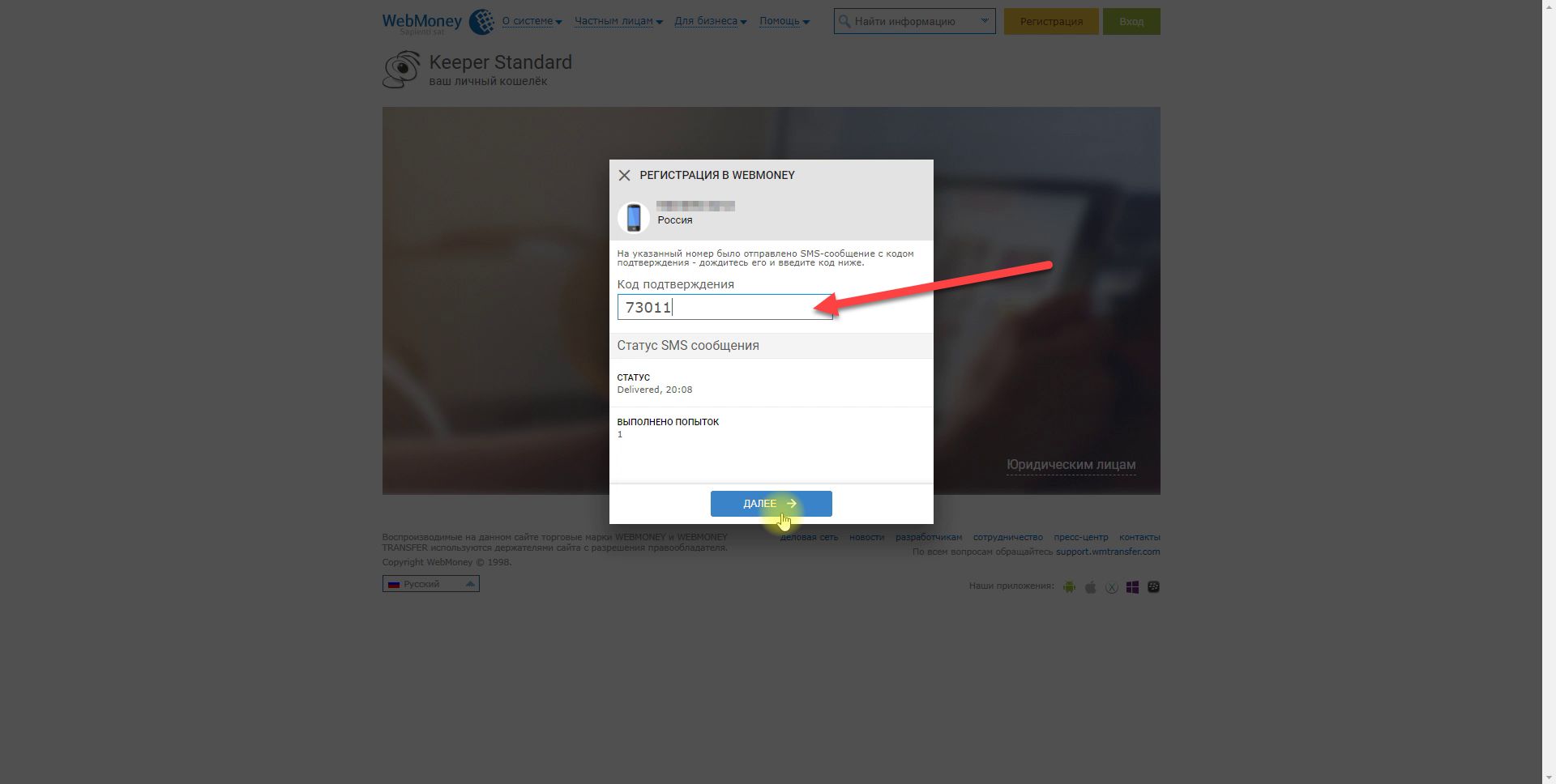 3. На телефон придет СМС с кодом подтверждения, вводим код и нажимаем кнопку "Далее".