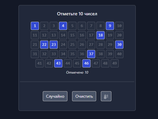 - Гибкость под ваш бюджет: на сайте представлены системы с разным количеством чисел и комбинаций (например, 10 чисел с гарантированной 4‑кой — это 10 комбинаций), что позволяет подобрать формат игры под свой бюджет.