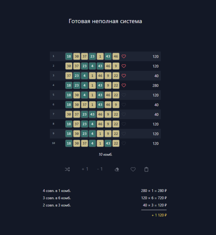 - Существенная экономия бюджета по сравнению с полными системами: вы покрываете часть комбинаций из выбранного набора чисел, не покупая все возможные билеты.