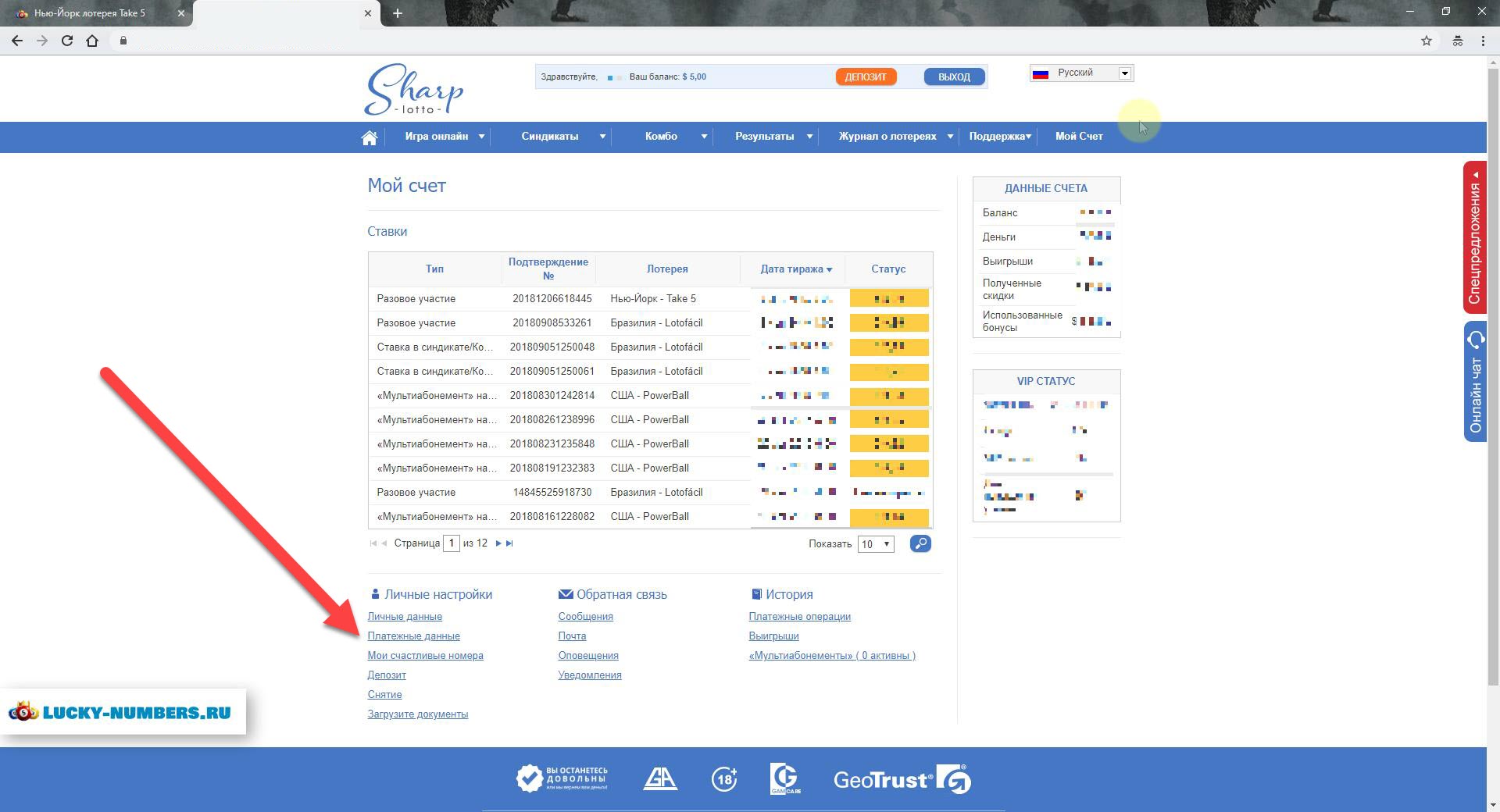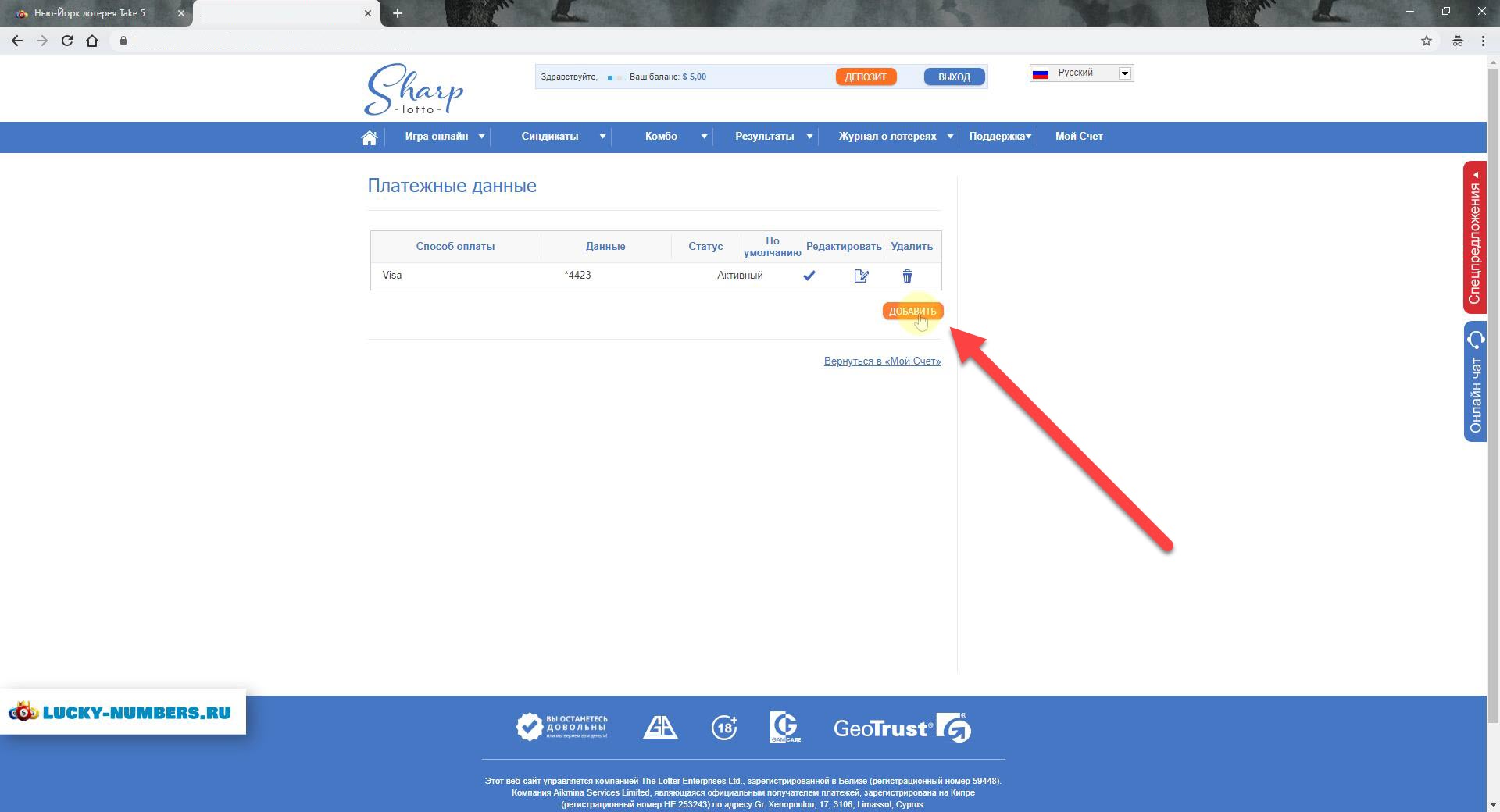1. Переходим на сайт TheLotter (SharpLotto) . Заходим под своим логином/паролем или регистрируемся. Потом переходим в раздел "Мой Счёт".