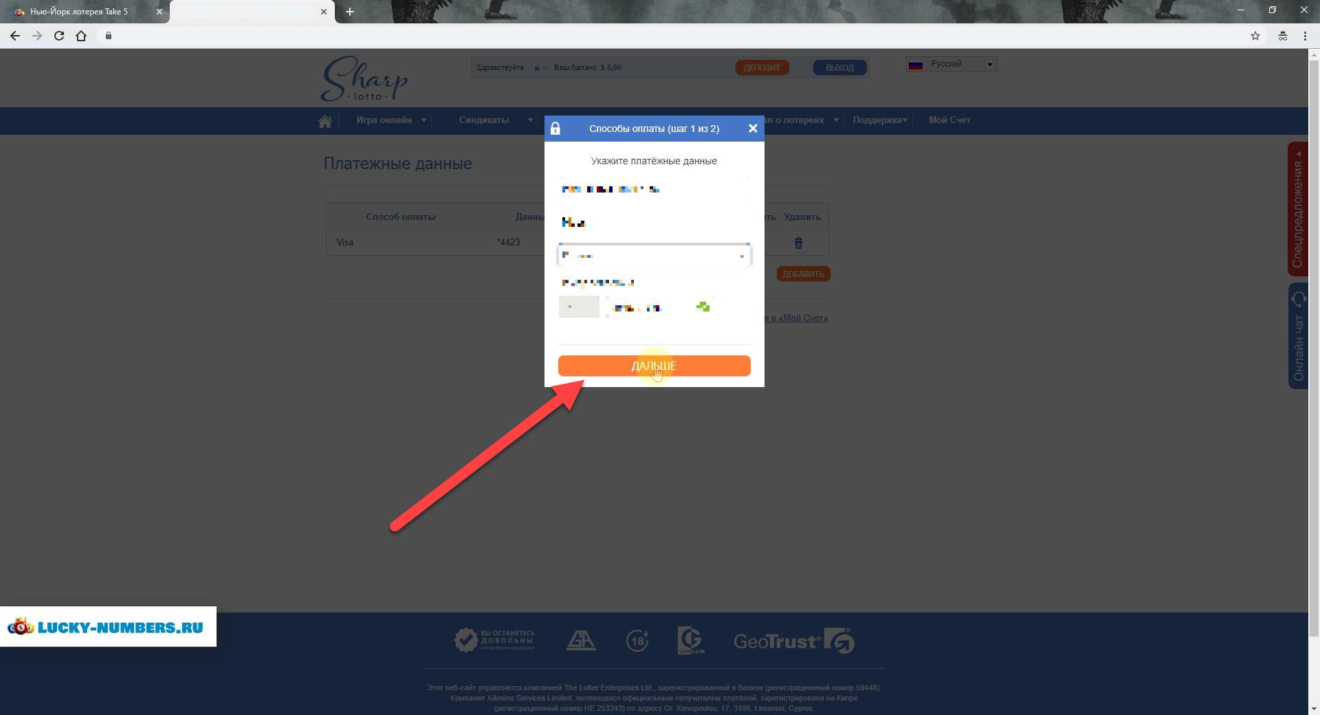 4. Указываете свои платежные данные и нажимаем "Дальше".