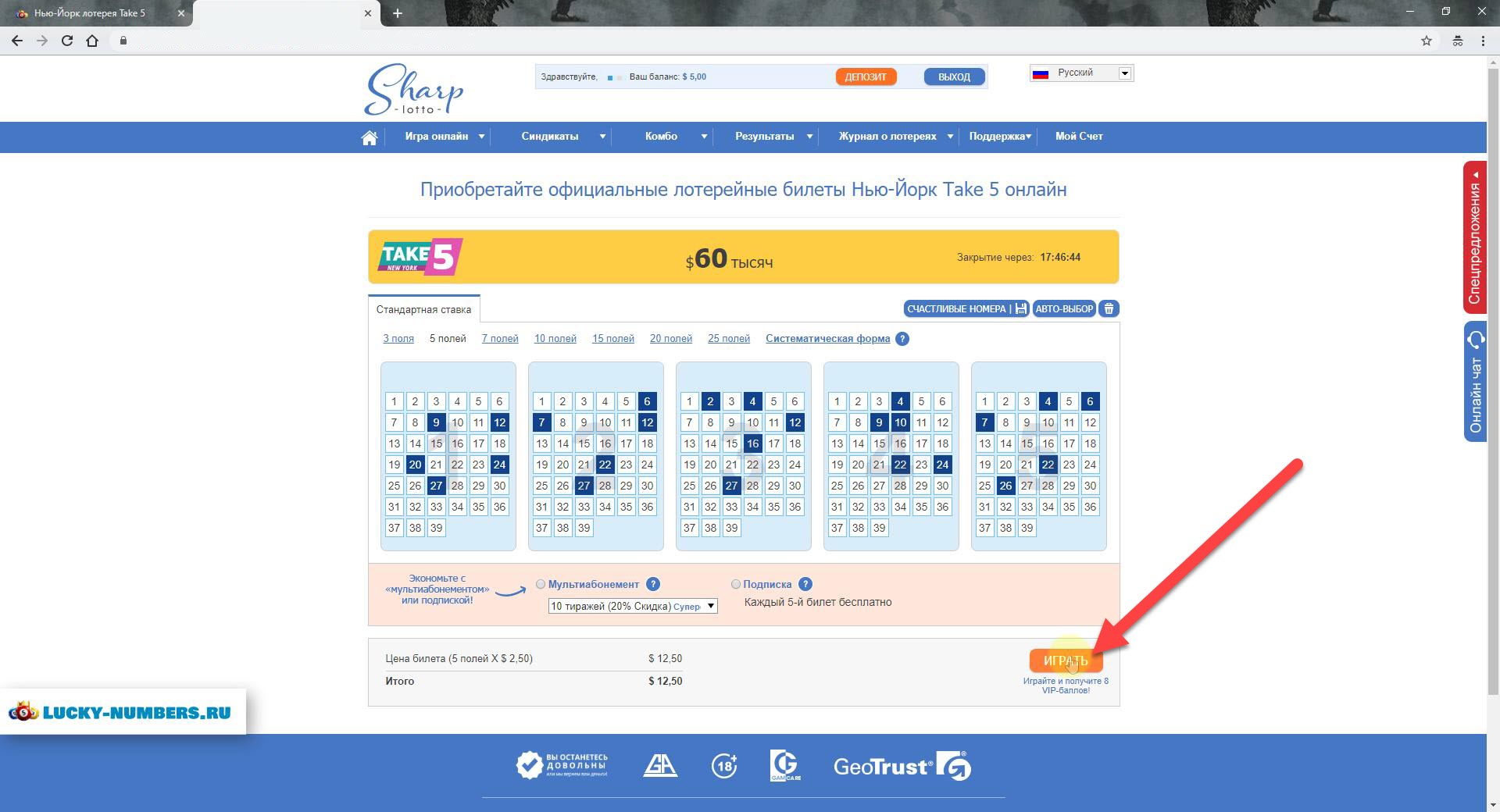 8. Выбираем лотерею, заполняем билеты, нажимаем "Играть".