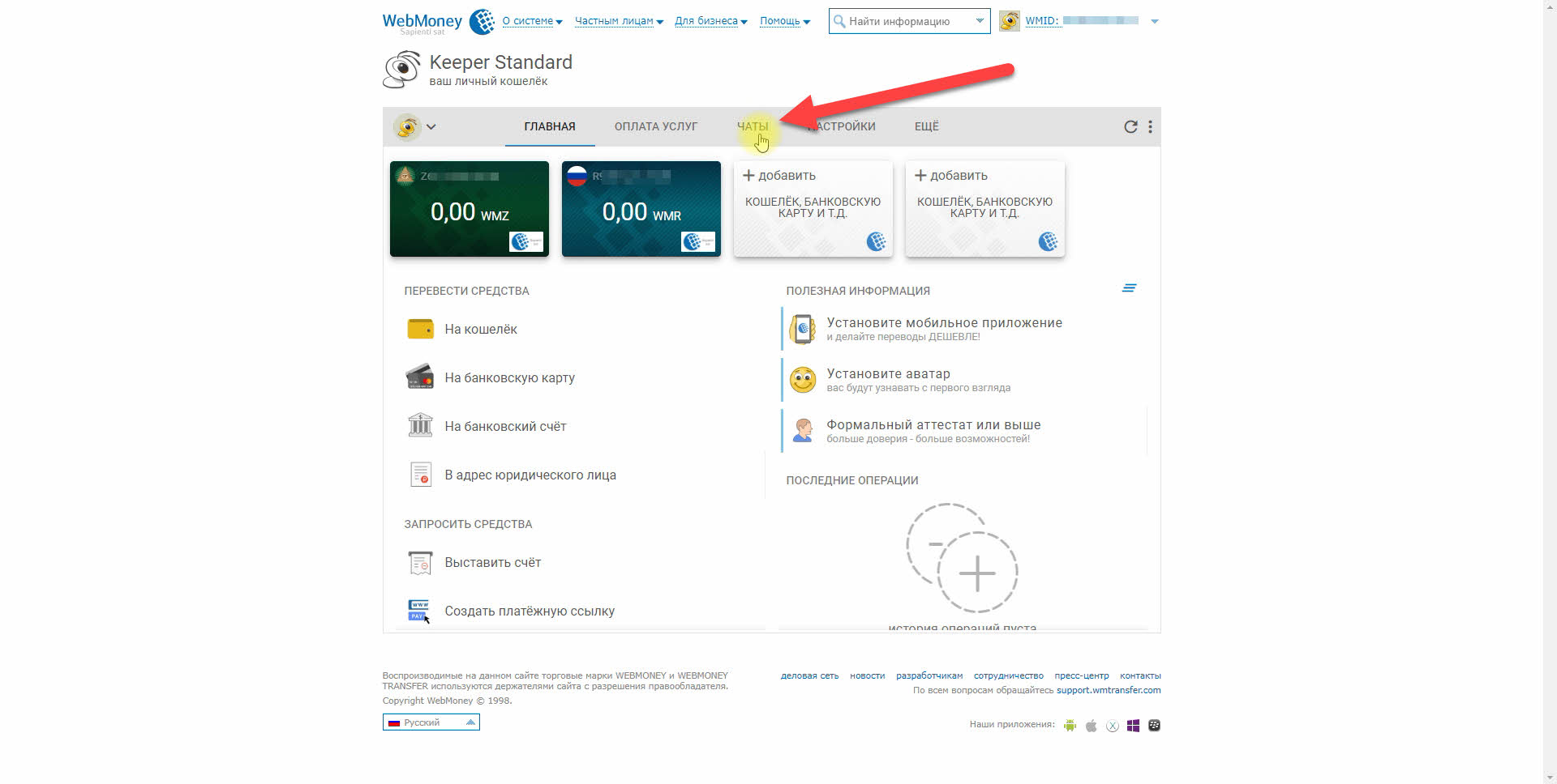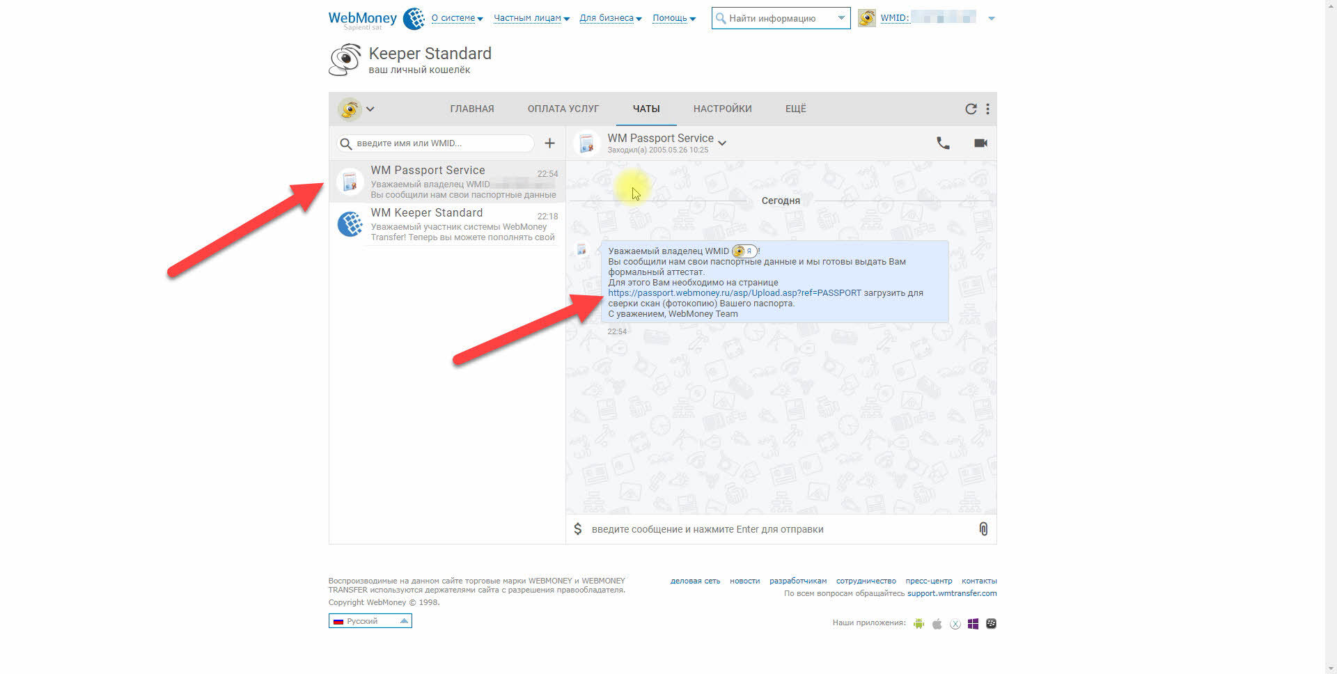 6. В разделе "Чаты" выбираем сообщение от "WM Passport Service" и нажимаем на ссылку https://passport.webmoney.ru/asp/Upload.asp?ref=PASSPORT.