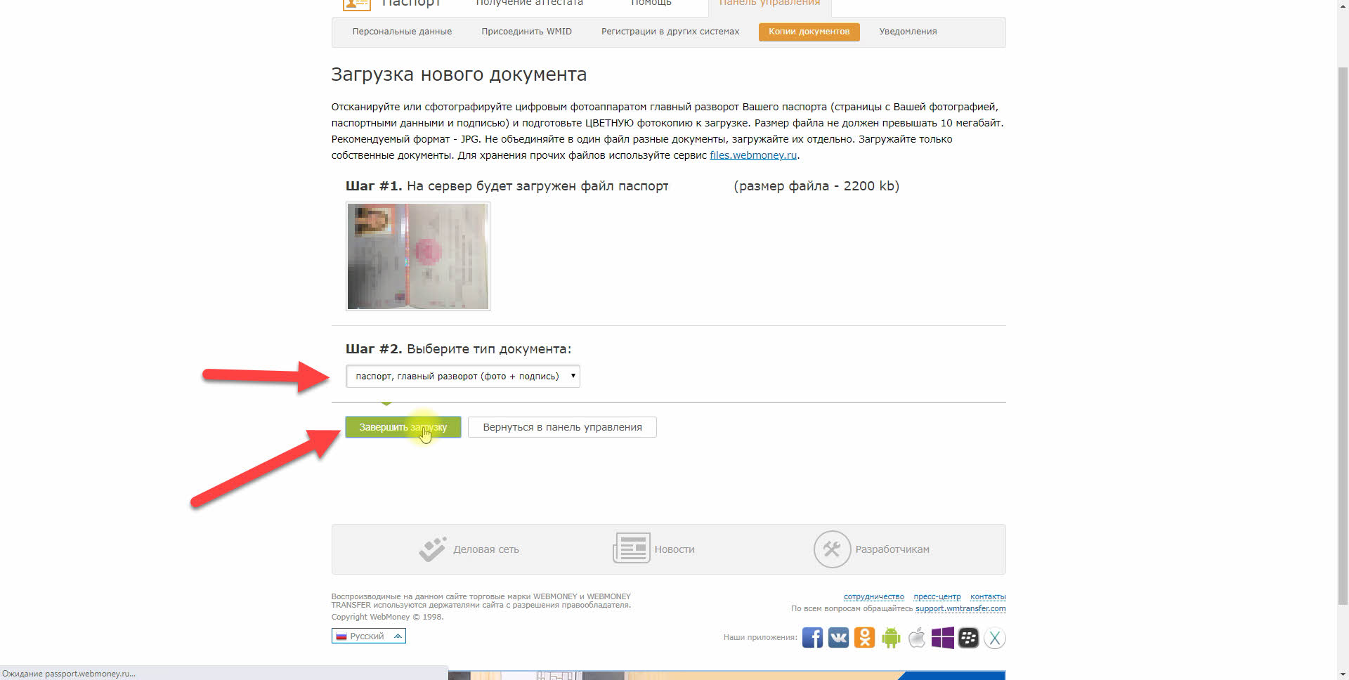 8. После загрузки фотографии выбираем тип документа и нажимаем "Завершить загрузку".